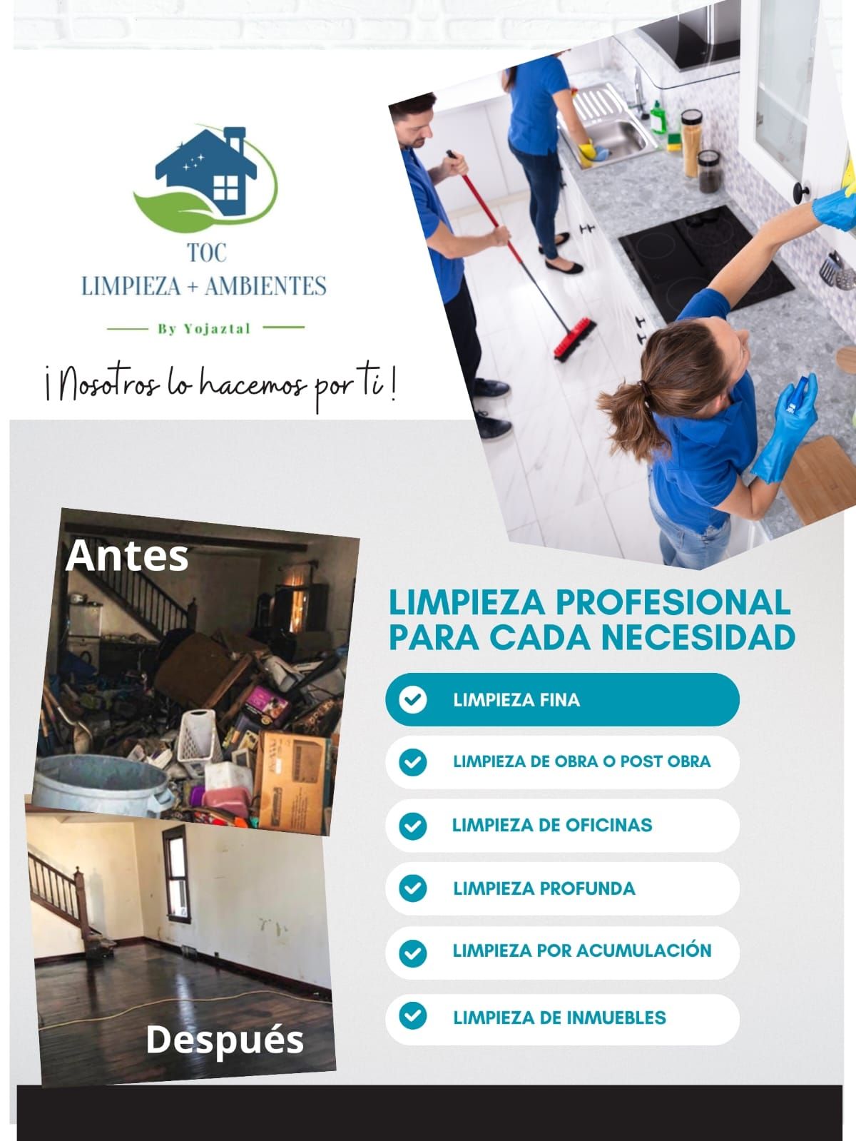 LIMPIEZA TOC, limpieza + ambientes es una compañía de mujeres dedicada a la prestación de servicios de intendencia, jardinería y fumigación a empresas y condominios en la Ciudad de México, garantizando el cumplimiento oportuno de obligaciones patronales y de la calidad y supervisión en los servicios contratados.